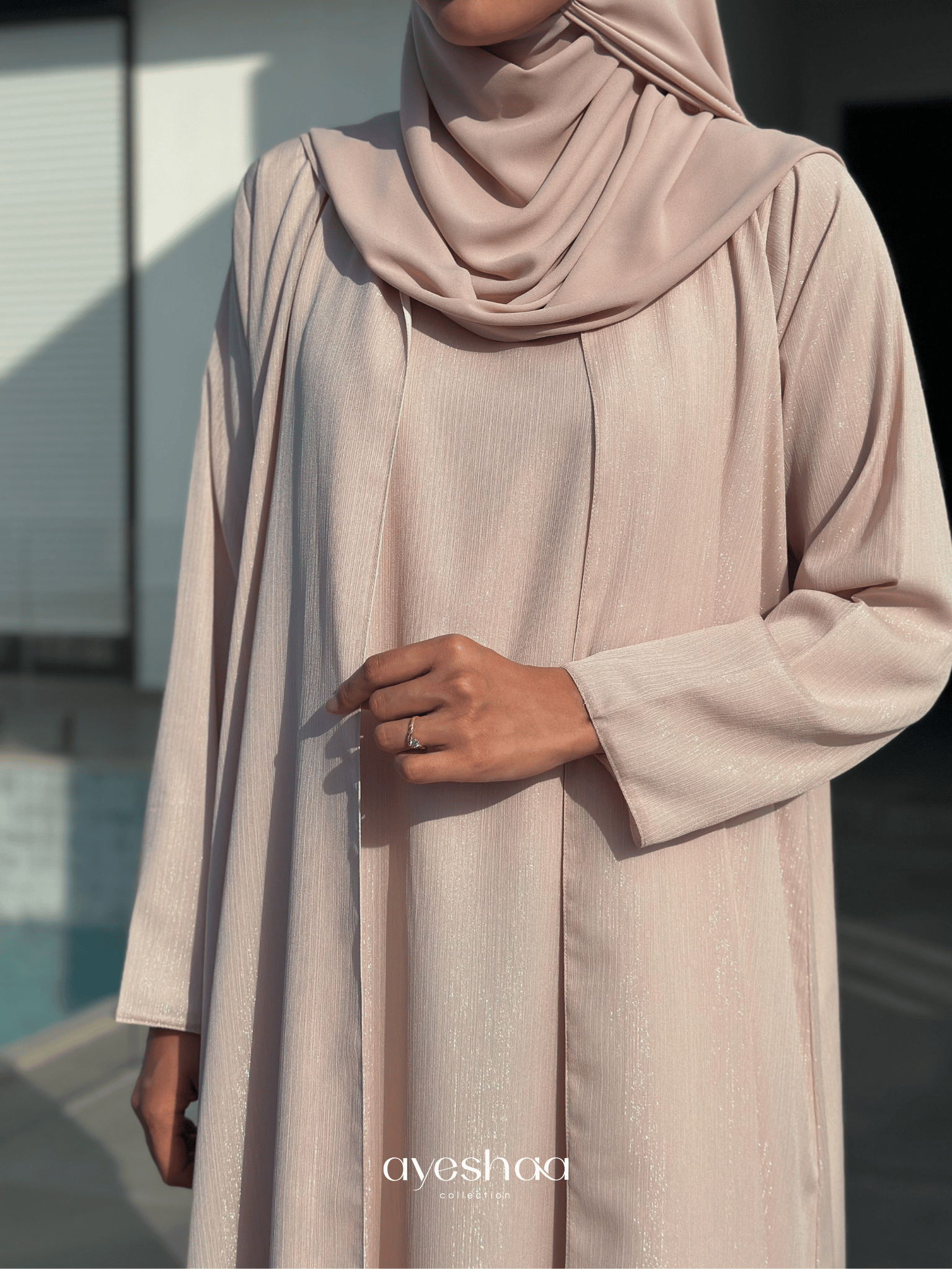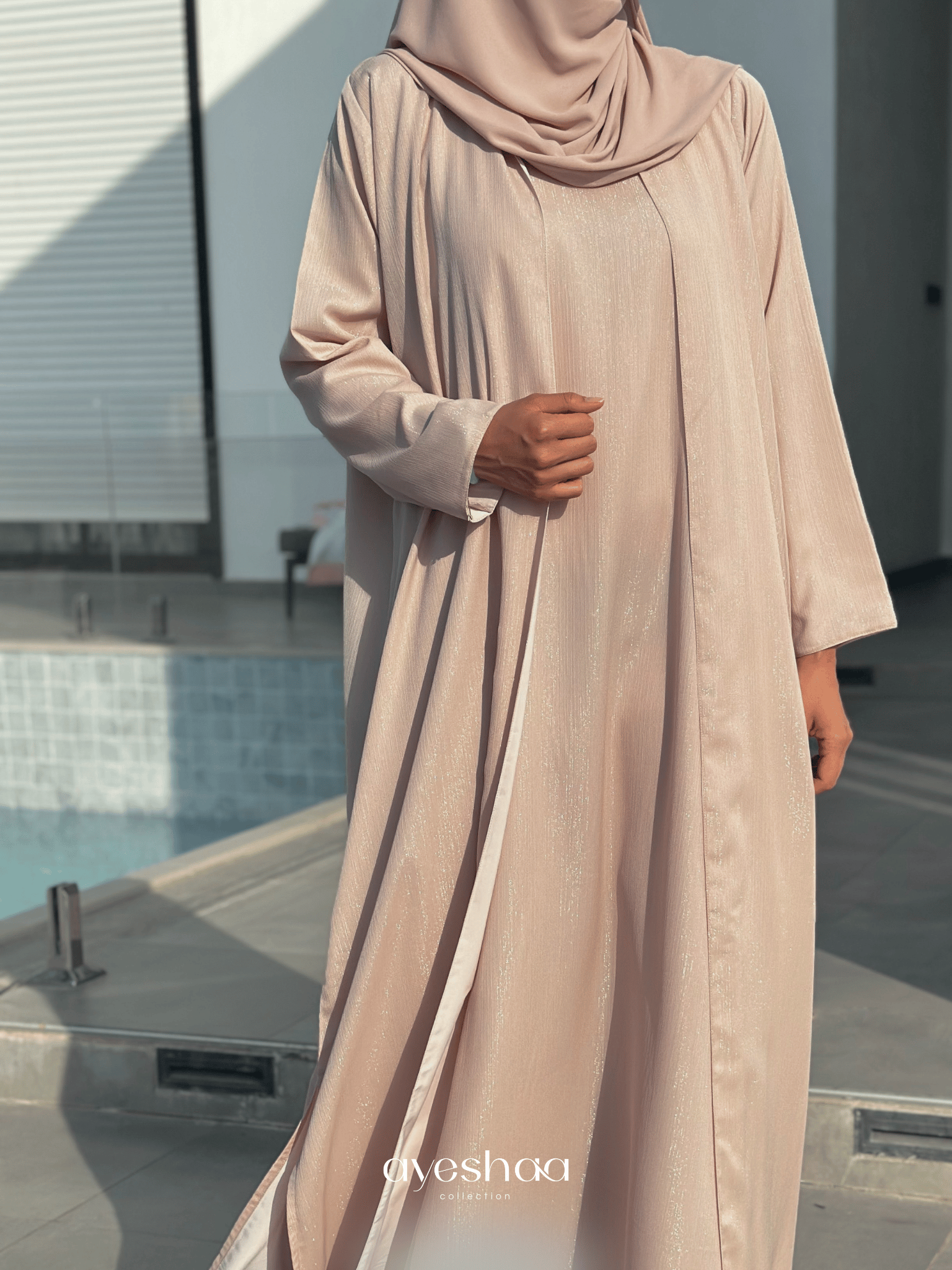 Our model is 165 cm tall and wears size 56. The hijab shown in the photos is in OAT beige.