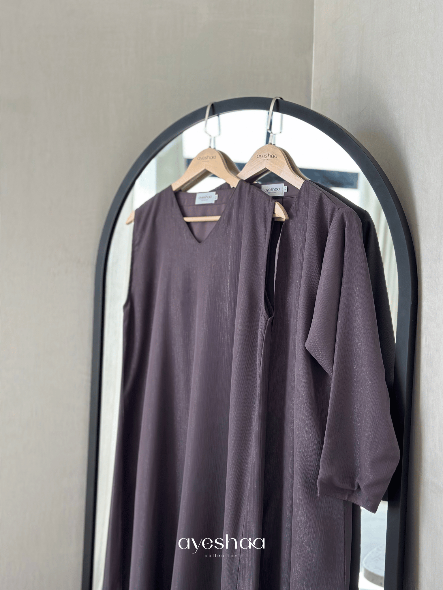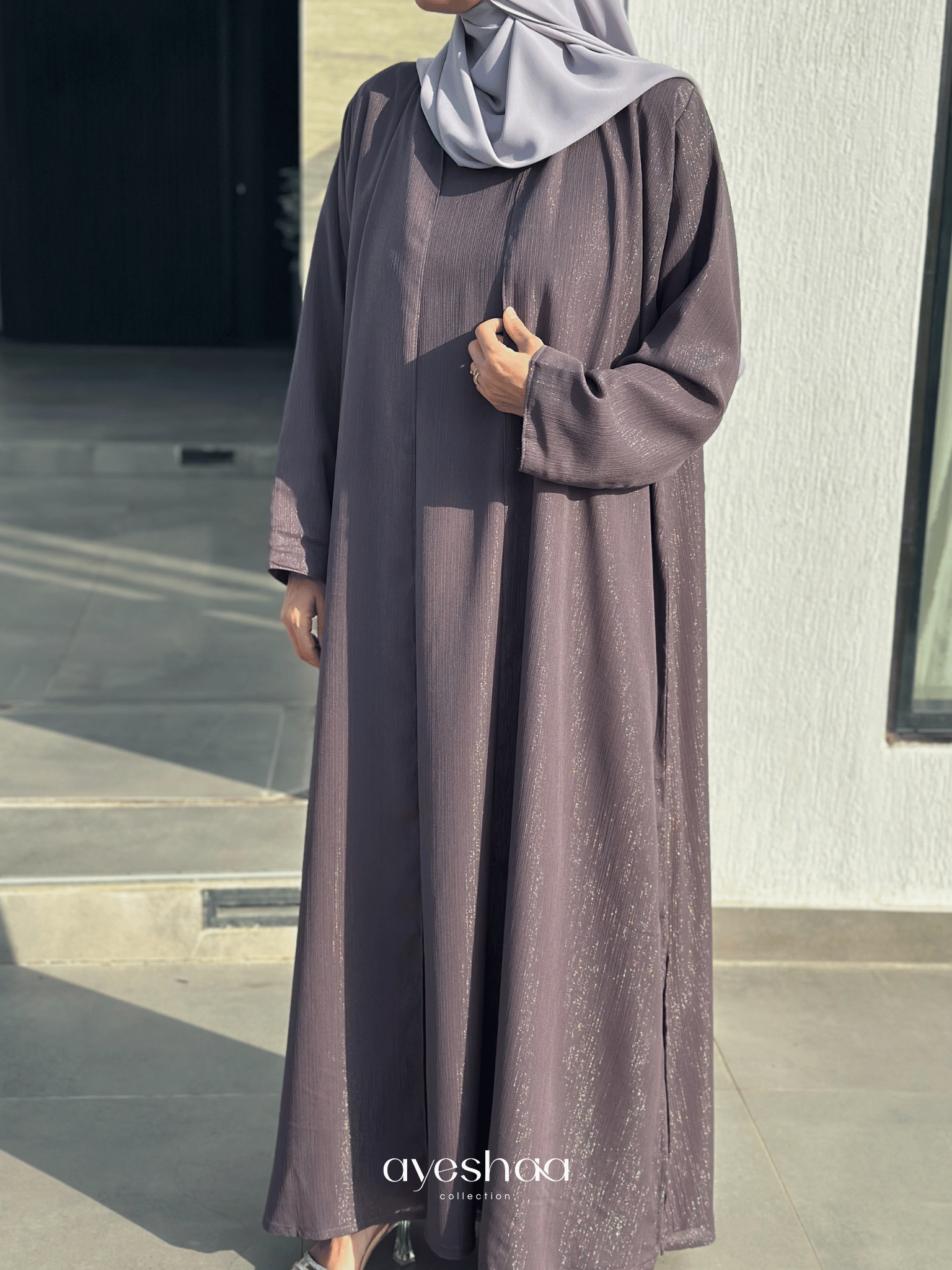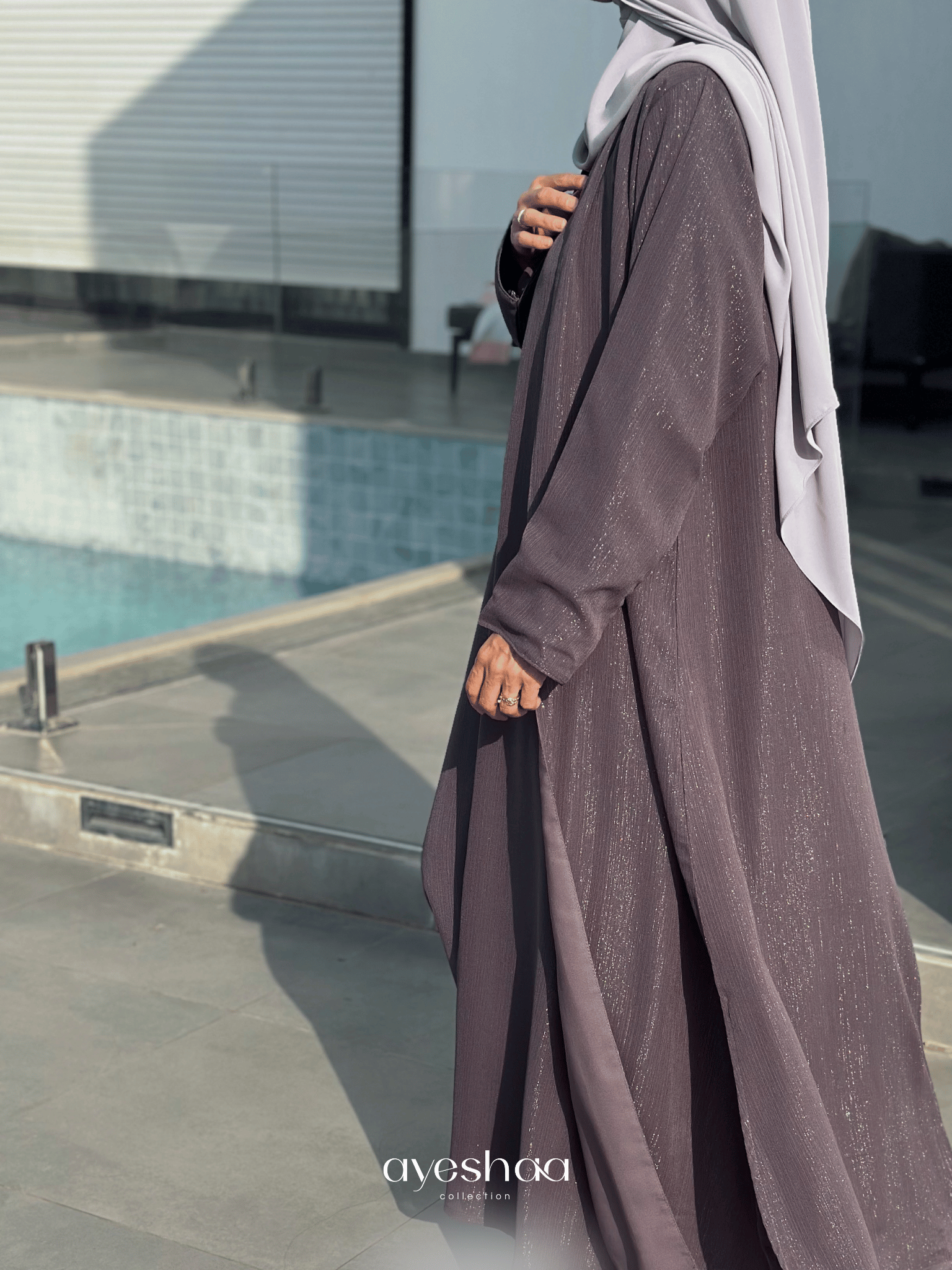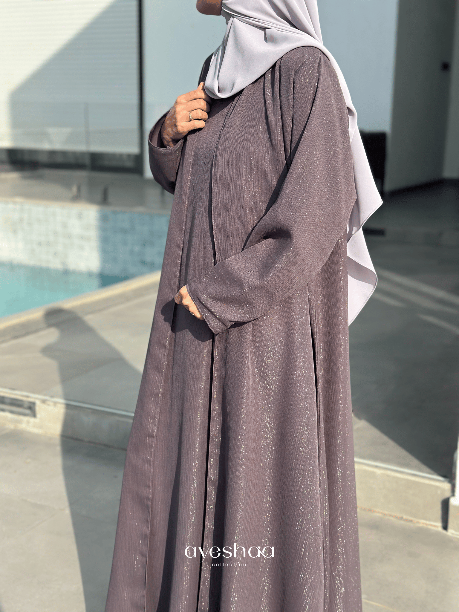 A modest ensemble that perfectly combines elegance and sophistication, it features a sleeveless under-abaya paired with an open kimono in a delicate, shimmering lavender mauve. Its subtle A-line cut ensures exceptional comfort while maintaining a chic silhouette.