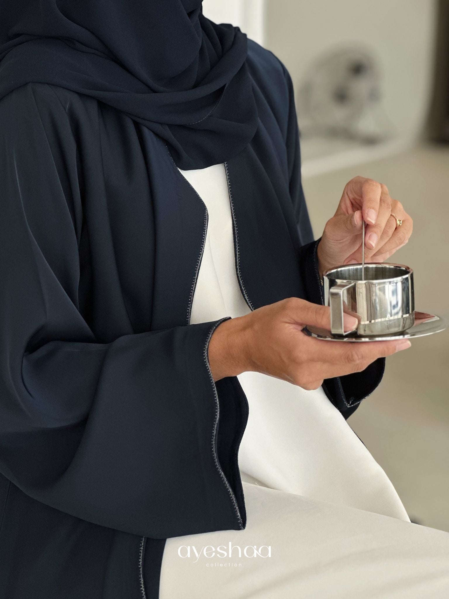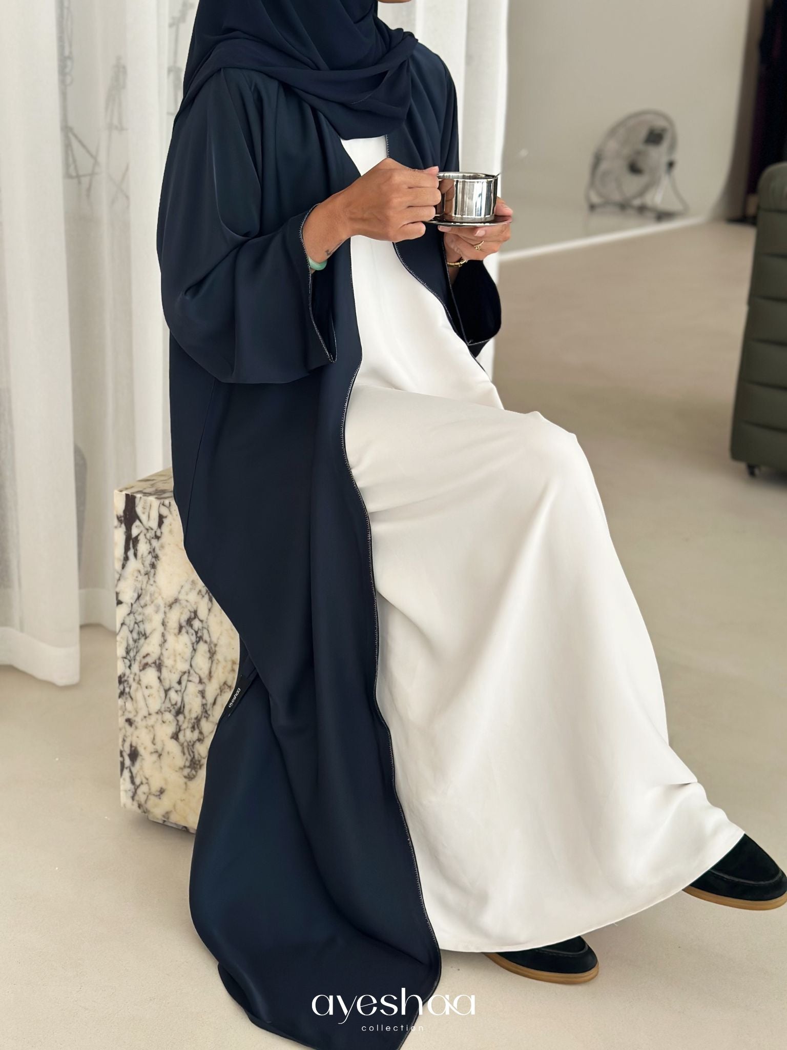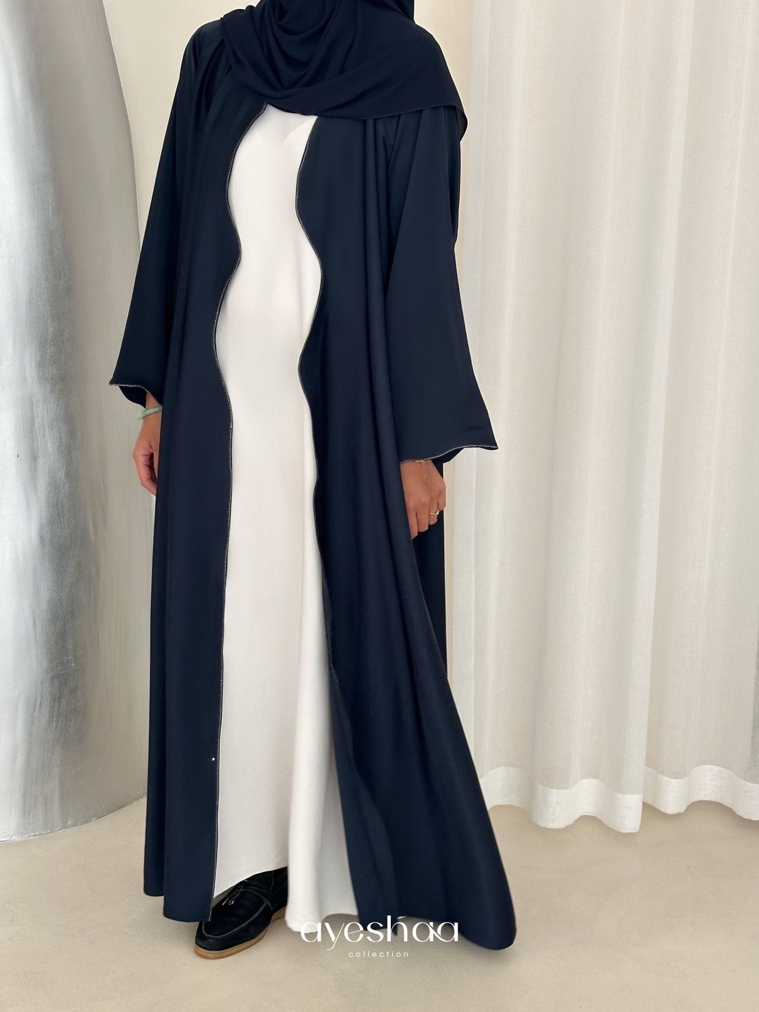 The Samiyah Kimono in deep navy blue is a standout piece, combining sophistication and modern elegance. Its silky, fluid fabric is both lightweight and opaque, offering comfort while beautifully enhancing your silhouette.