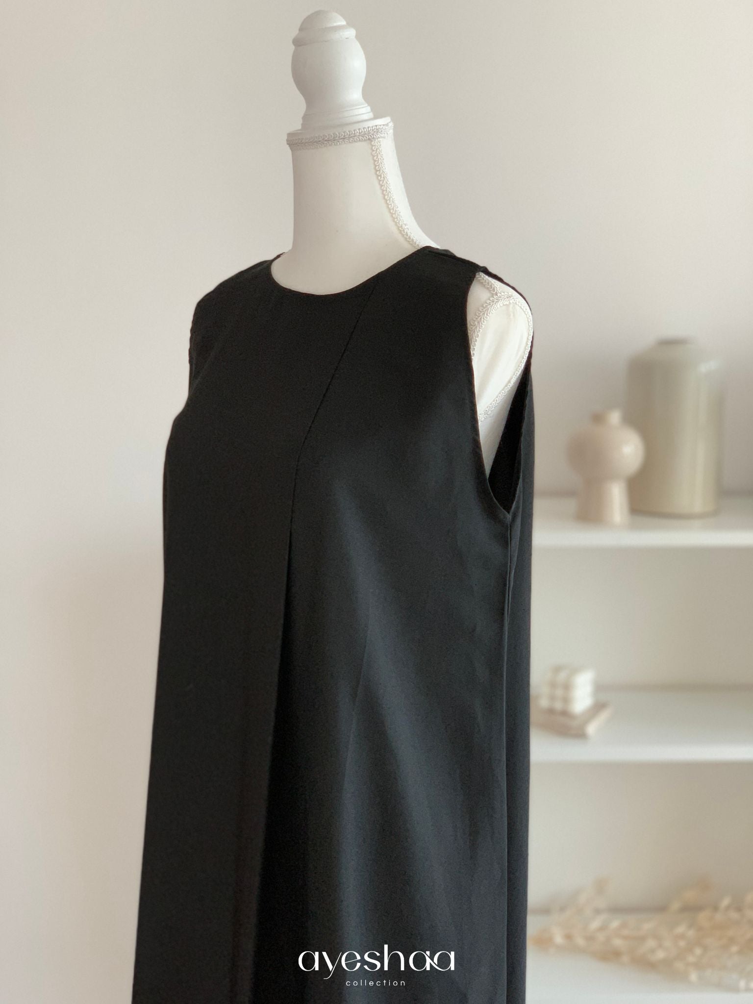 The Saheel under abaya is the perfect black sleeveless layering piece. Designed with a clean front pleat and a discreet opening at the neck, it combines style and practicality.