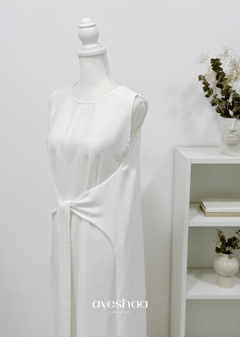 Our model, 150 cm tall, wears size 52, styled with the white Minhah under-abaya and the Line Deep hijab.
