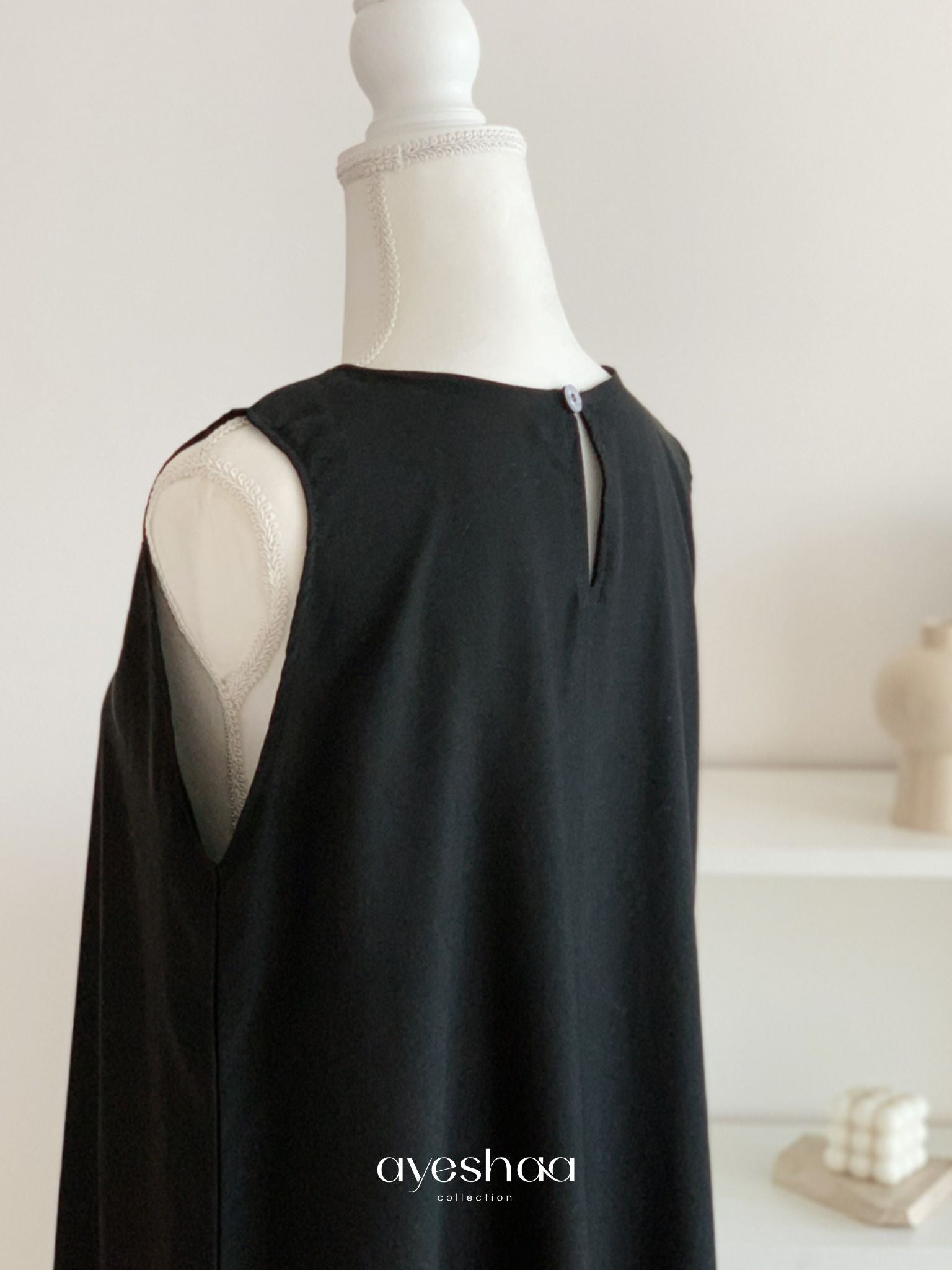 The Saheel under abaya is the perfect black sleeveless layering piece. Designed with a clean front pleat and a discreet opening at the neck, it combines style and practicality.