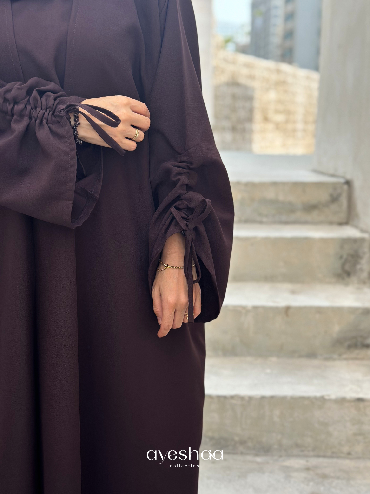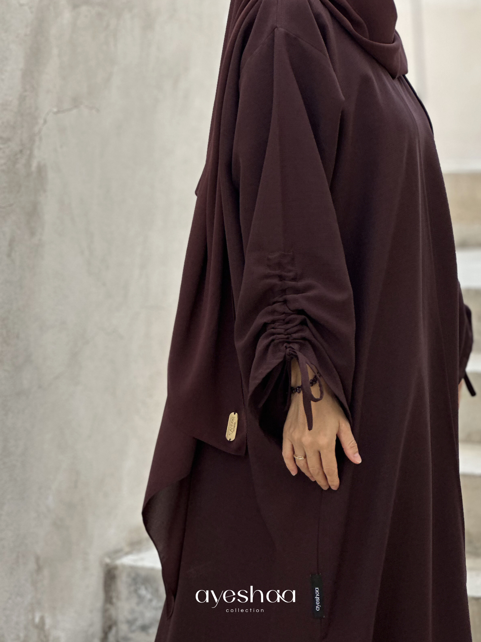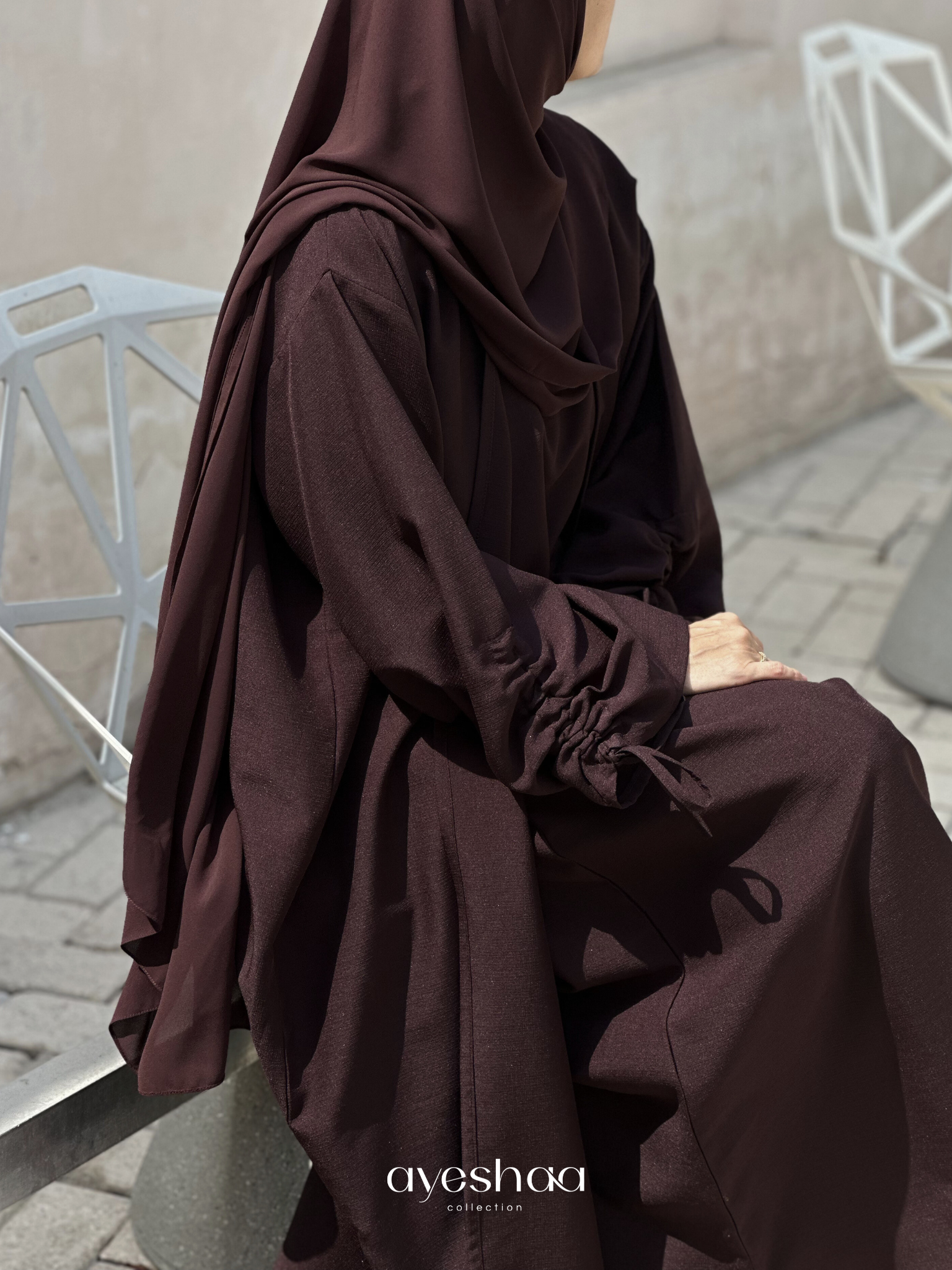 This modest set features a sleeveless inner dress with a delicate V-neckline, paired with a stylish brown kimono. The kimono stands out with its adjustable sleeves, allowing you to roll them up to create more volume and movement according to your preference.