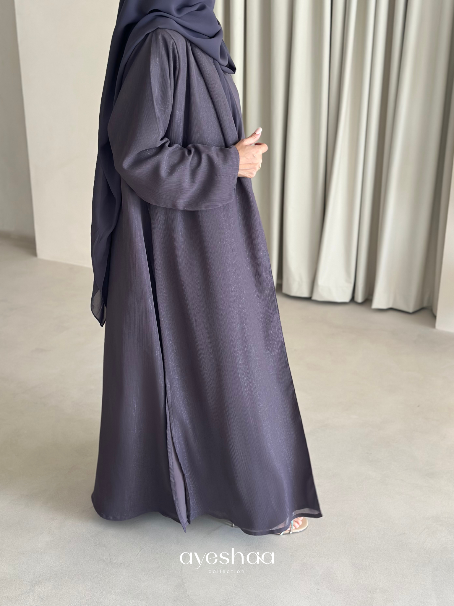 A modest ensemble that perfectly combines elegance and sophistication, it features a sleeveless under-abaya paired with an open kimono in a delicate, shimmering lavender mauve. Its subtle A-line cut ensures exceptional comfort while maintaining a chic silhouette.