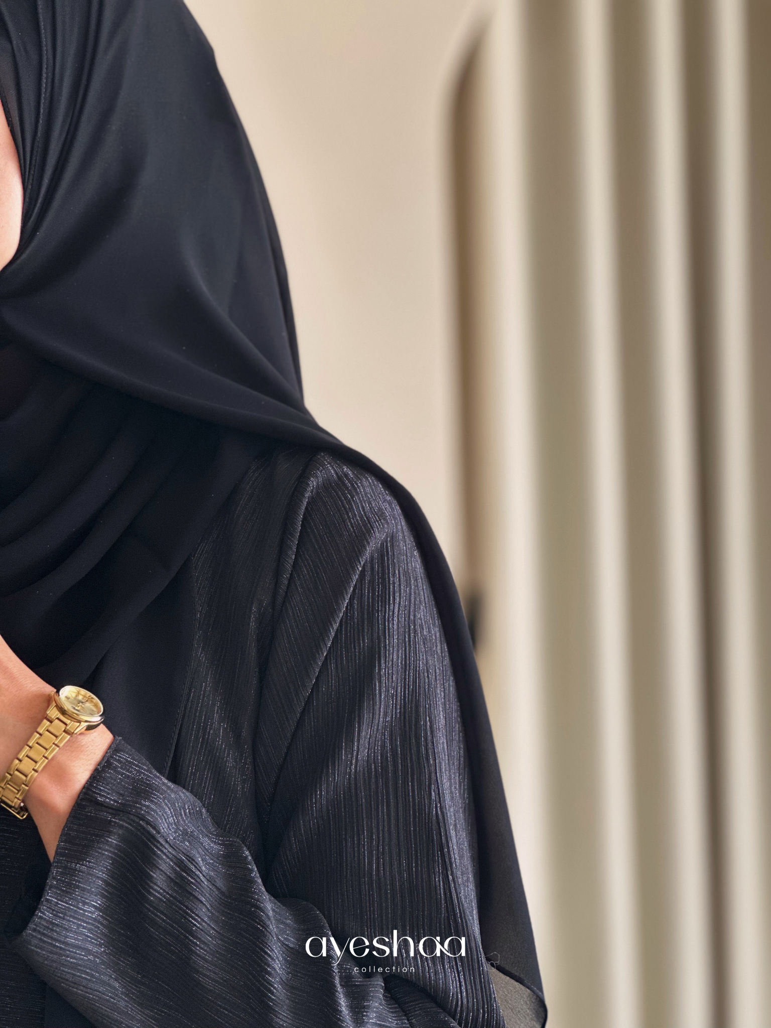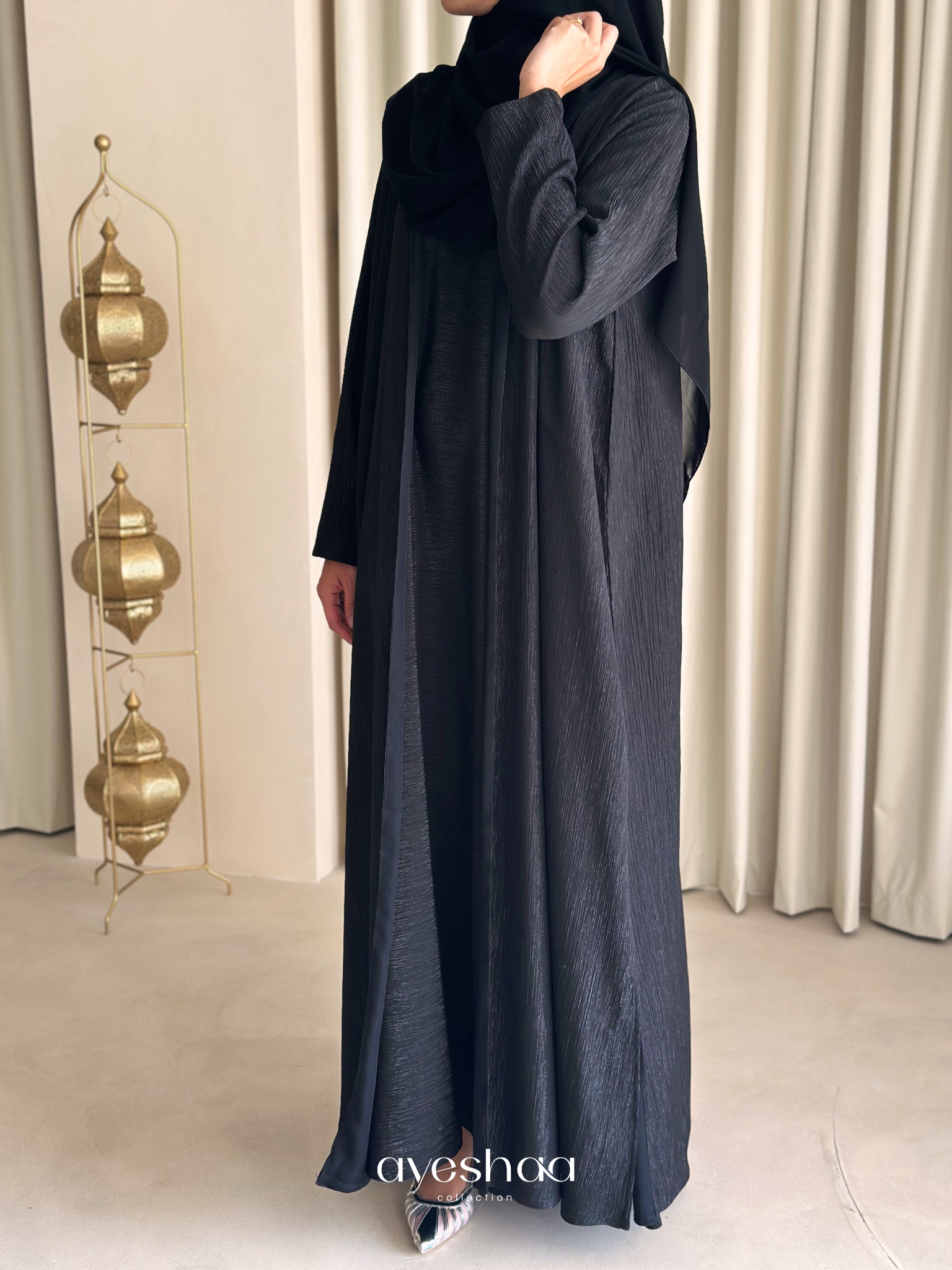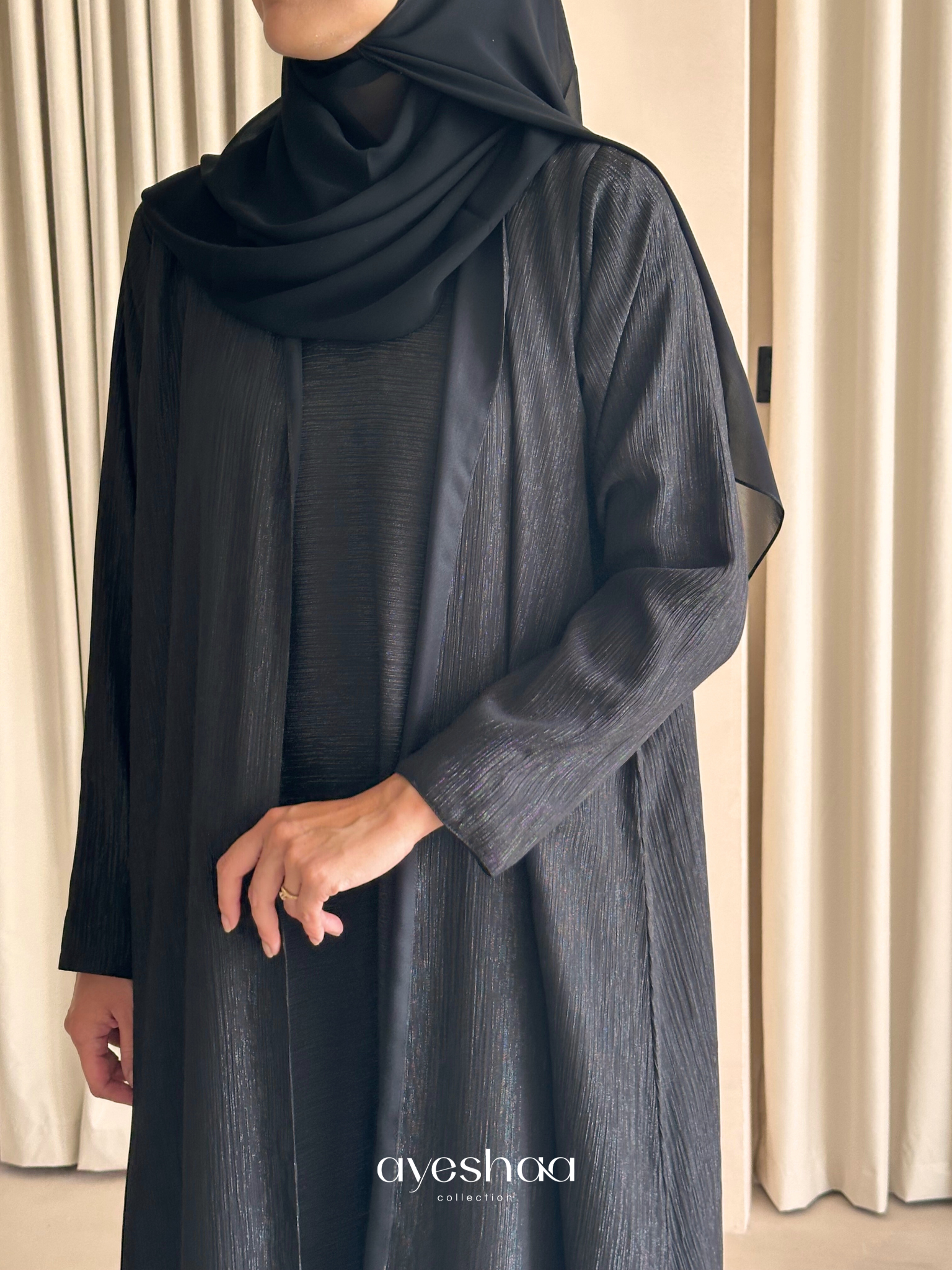 A matching chiffon hijab is exceptionally included, carefully selected to complement the piece and create a refined monochrome look.
